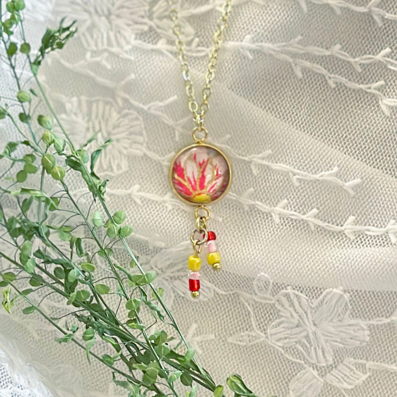 The Isla necklace embodies timeless romance inspired by the vibrant elegance of Chiyogami paper. This striking piece adds a refined, colorful accent to any look. Accented with glass beads, it is the perfect way to express your distinct style.